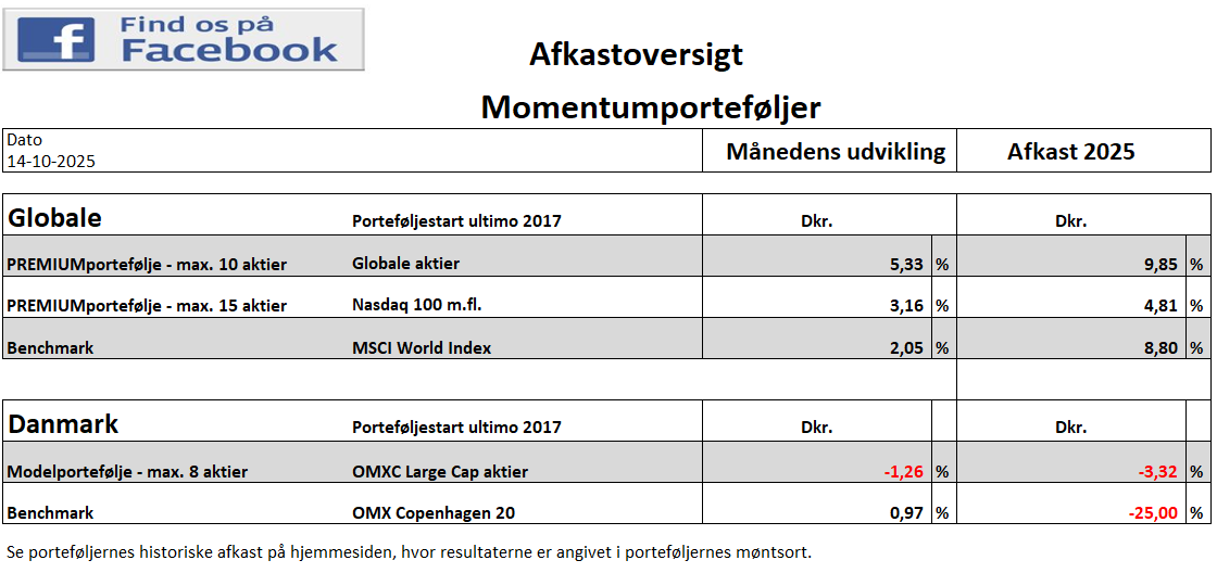 Overblik over seneste afkast på momentumporteføljerne.